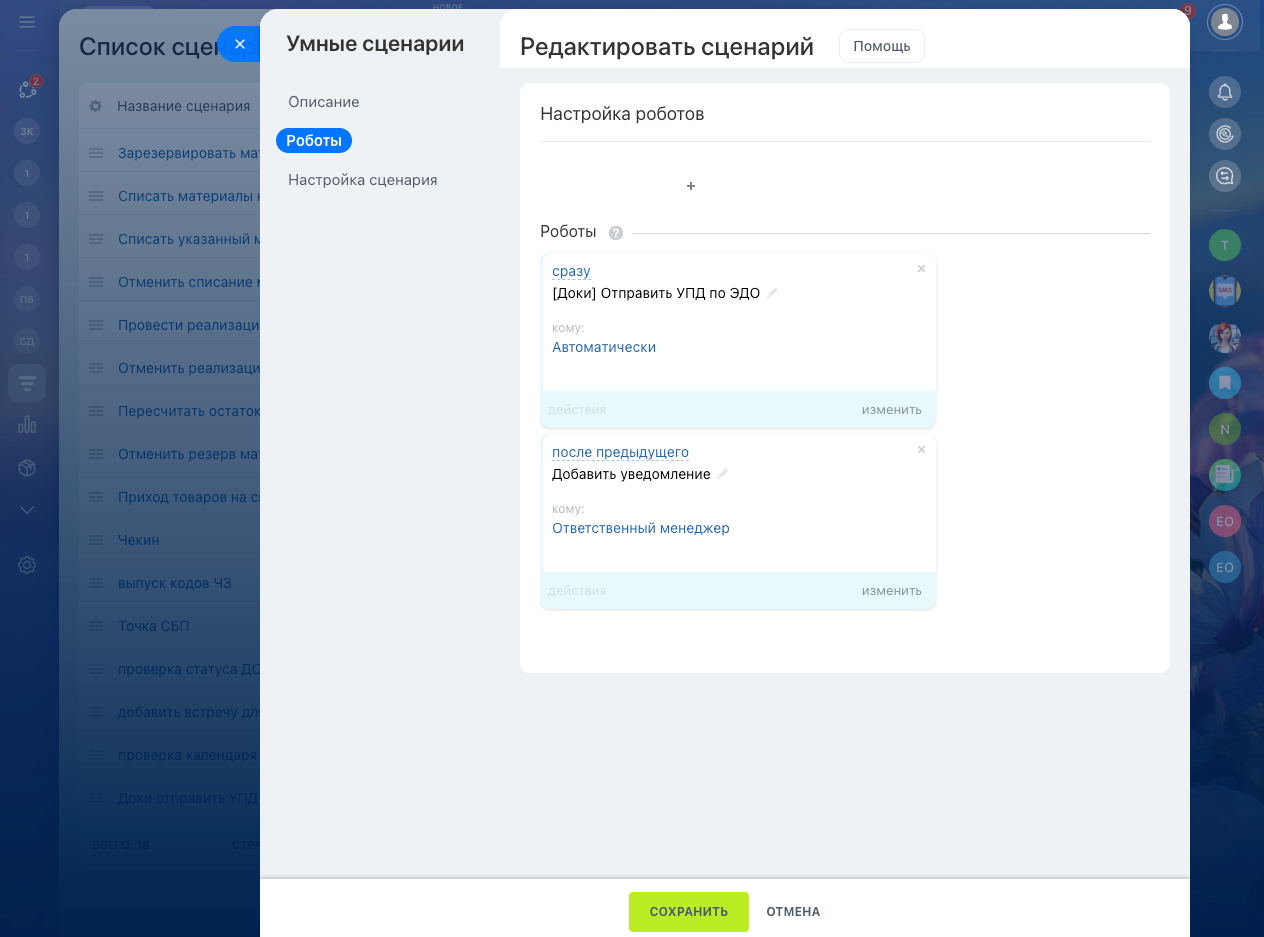CRM роботы которые добавляет приложение позволяют автоматизировать процесс отправки документов контрагентам.