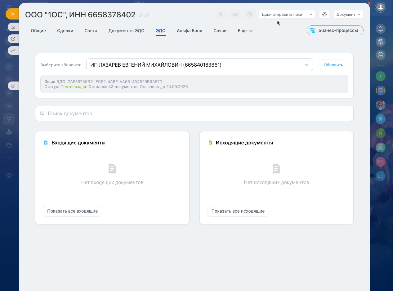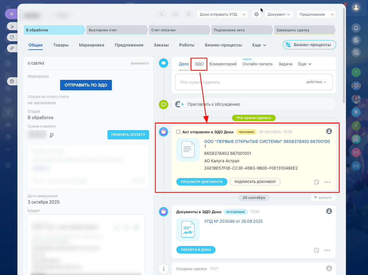 Отправляйте УПД и документы прямо из карточки CRM. Отправленные документы из Битрикс24 появятся в разделе черновики системы Доки.